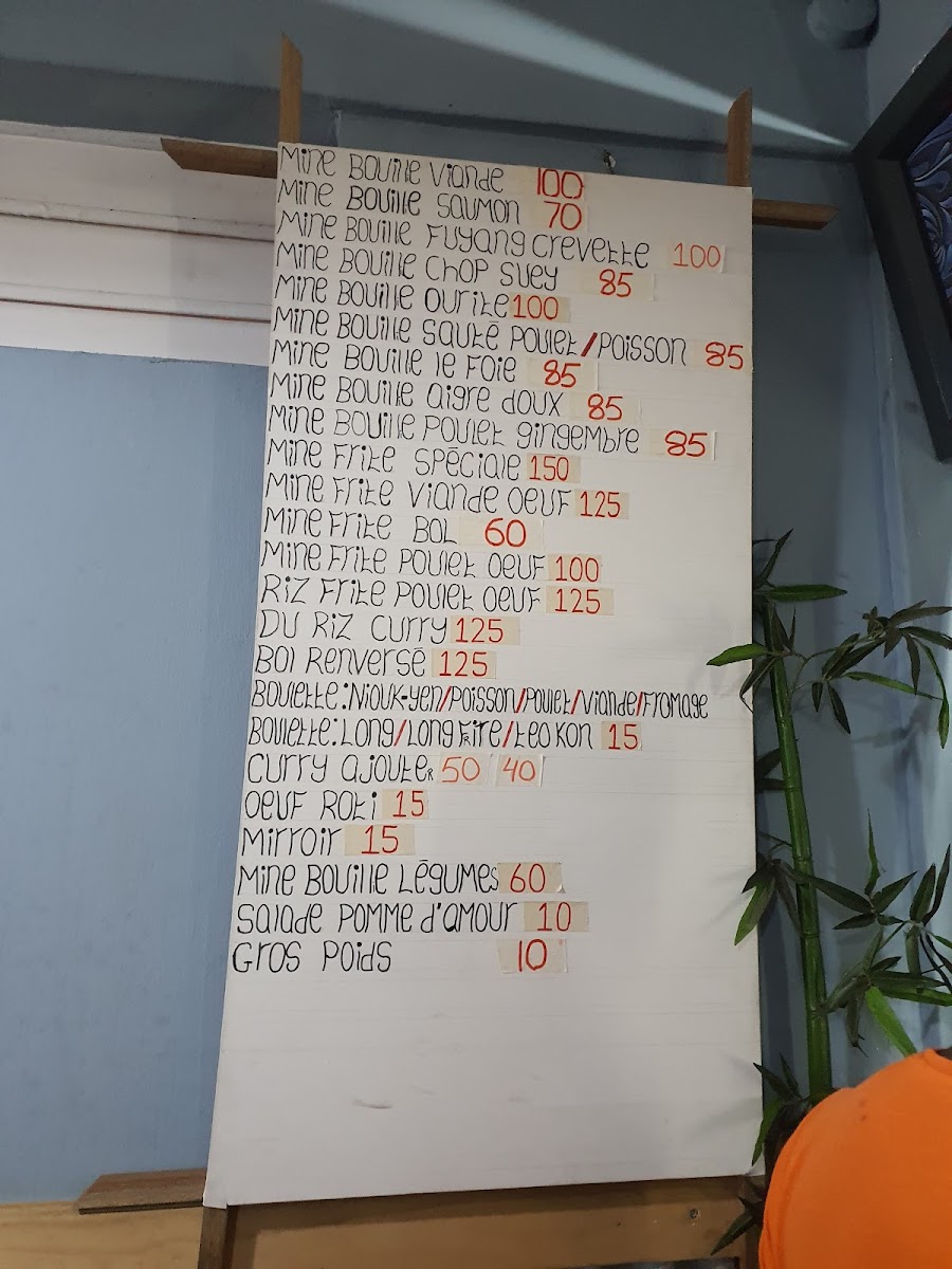 The selection also includes approachable sides and accompaniments like boulette (dumplings) and flavorful options like fooyang crevette or poulet gingembre, adding subtle depth to the overall dining experience. These choices reflect the balanced, everyday appeal of the menu—enough variety to satisfy different preferences, yet uncomplicated enough to feel familiar and comforting.